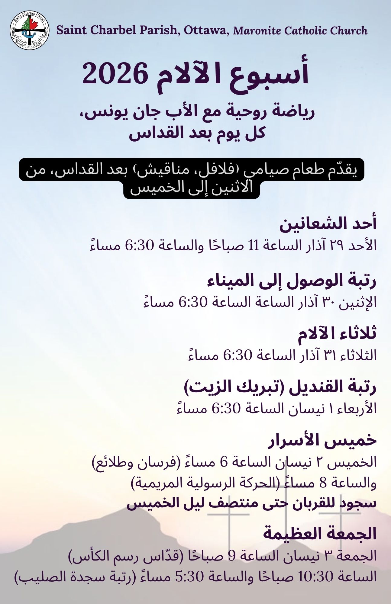 NEW DATES-Palm Sunday, Holy Week Schedule 2026 at Saint Charbel Parish, Ottawa - Spiritual Retreat from March 29 to April 5, 2026 - Lenten food (falafel, mana2ish) will be available after mass, from Monday to Thursday ======================================================= مواعيد جديدة - أحد الشعانين، جدول أسبوع الآلام 2026 في رعية مار شربل، أوتاوا - رياضة روحية من 29 آذار إلى 5 نيسان 2026 - وجبات خاصة بالصوم الكبير (فلافل، مناقيش) متوفرة بعد القداس، من الاثنين إلى الخميس